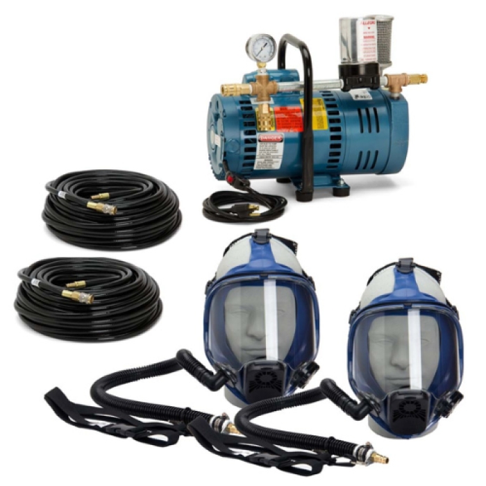 This Allegro full mask system provides a portable air source. The kit includes 2 full masks supplied air respirators, a 3/4 hp ambient air pump, and 100 feet of breathing air hose. The masks are comfortable with only soft silicone rubber touching the face. The lens is made from polycarbonate and meets ANSI Z87.1 requirements. The wide field of distortion-free vision is offered with anti-fog and anti-scratch coatings. Ambient air breathing pumps are designed to be used outside the contaminated work environment to bring clean, breathable air into a supplied air respirator. They are portable and oil-less, producing no carbon monoxide, oil vapors or oil mist, thus eliminating the need for carbon monoxide monitoring and alarm systems. All pumps come fully assembled with all filters, fittings, and couplers.
