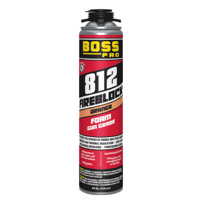 BOSS® 812 Fire Block Foam prevents the spread of smoke and toxic gasses from one compartment to another, thereby slowing down the spread of fire, due to lack of air to fuel the flames. BOSS® 812 has excellent insulation and acoustic properties and is also paintable (after inspection). BOSS® 812 has been tested to ASTM E-84 and UL 723. Aerosol Gun Grade Can 81220-24 Oz.