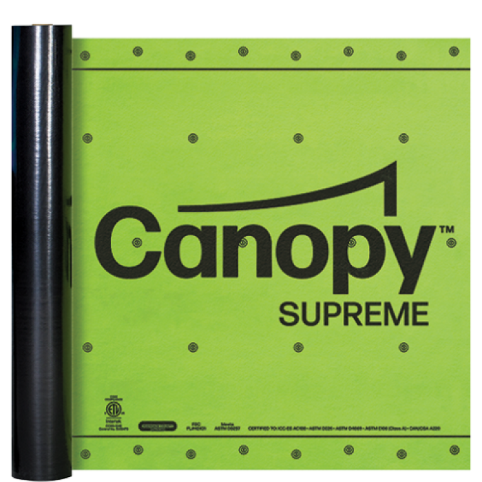 CanopyTM SUPREME C50 is a 4-layer synthetic underlayment, with a polypropylene woven core, a polypropylene non-woven top layer and an anti-slip polyolefin coated bottom layer, engineered to enhance the lifespan of a roof. It is ideal for use under fiberglass, asphalt and modified bitumen shingles, tile, slate, and metal roofs.