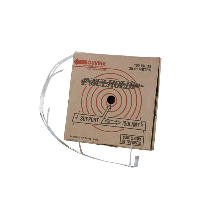 Insul-Hold® holds rigid or batt insulation. The unique design simplifies installation, doubles as reinforcement strapping and meets federal specifications. Insulation is impaled on the 2-1/2 in arrow prongs which are on 8 in centers. Use with either 16 in or 24 in on center. Product is 0.025 to 0.028 in thick and 1 in wide. It is cold rolled and hot dipped galvanized with a dry finish.