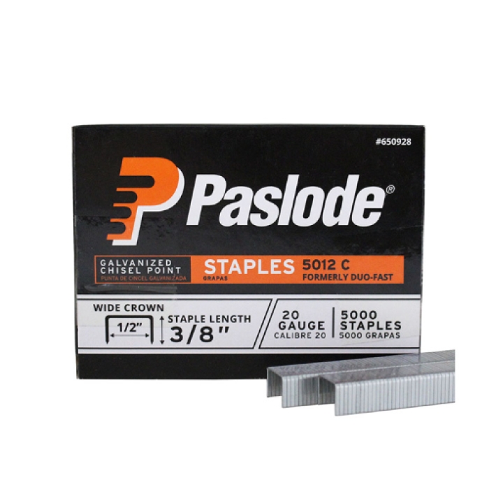 Paslode 5012C 1/2 in. W Crown 3/8 in. 20-Gauge Leg Galvanized Steel Staple (5000 Per Box) can be used for construction purposes with excellent strip integrity for superior holding power. Paslode 5000 series staples are 20% wider. To optimize your Stapling experience, make sure to use Paslode staples with Paslode Staplers.