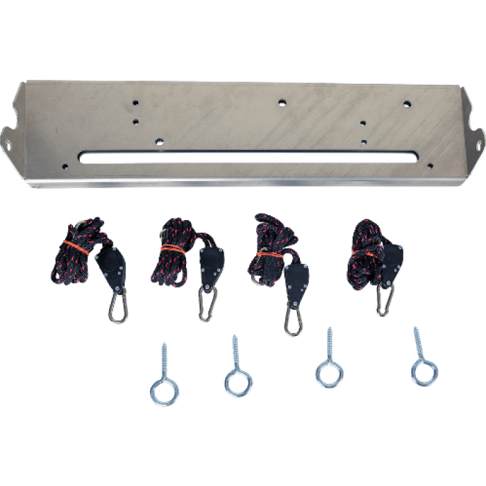 This kit includes 4 ratchet straps, which are heavy-duty and adjustable and can hold up to 150 pounds each, as well as 2 brackets and 4 eye bolts. One single person can install the kit with the included complete installation guide. Extra tools required are a tape measure, a level, and a screw driver (Philips or Regular). A power drill may also be used to pre-drill holes for the eye bolts.